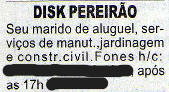 É, parece que o trabalho de Griselda (Lilia Cabral) na novela “Fina Estampa”, da TV Globo, está estimulando outras pessoas na vida real. O anúncio abaixo não é ficcional e foi publicado no Jornal Cruzeiro do Sul, da cidade de Sorocaba.